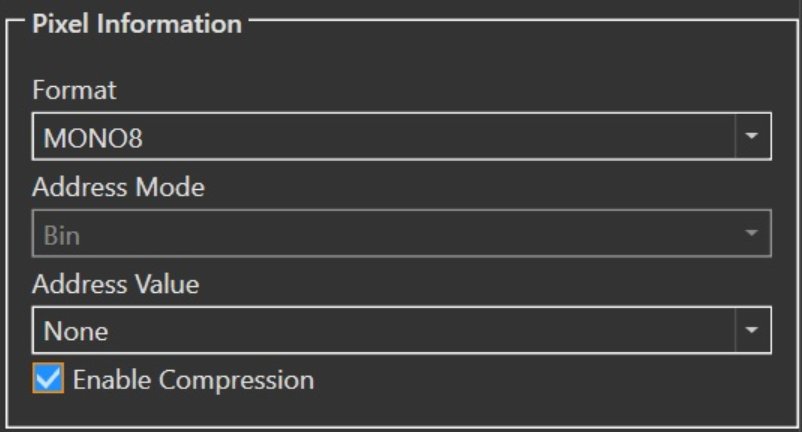Enabling compression will allow the camera to output compressed images using our lossless compression scheme. The images are decompressed by the Pixelink software on the host side. This feature reduces the amount of data being transferred over the USB link, and is helpful when running multiple cameras on a single bus.