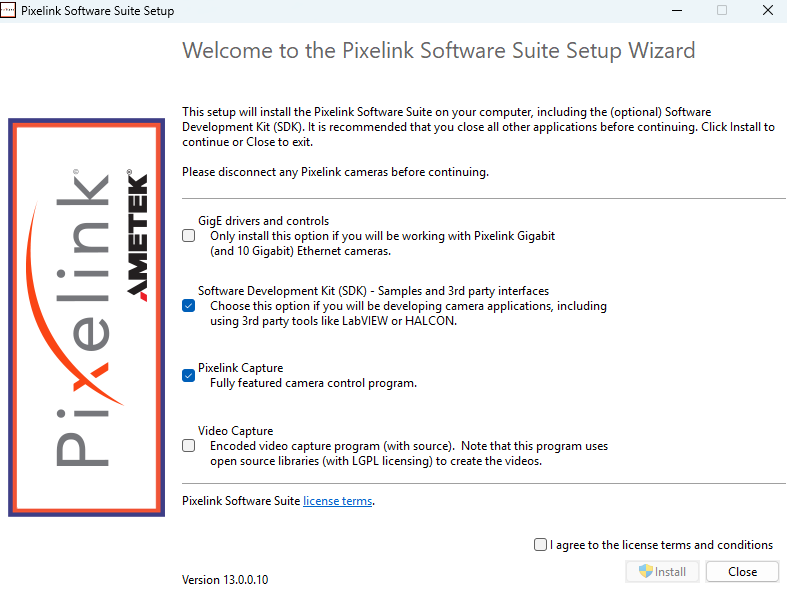 The installer has 4 optional components, which are explained below. We recommend that most users enable the Pixelink Capture option. If you do not enable any options, then only the Pixelink camera drivers will be installed.