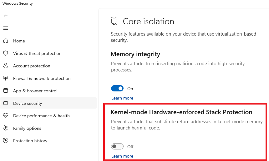 2. Disable the Kernel-mode Hardware-enforced Stack Protection toggle button